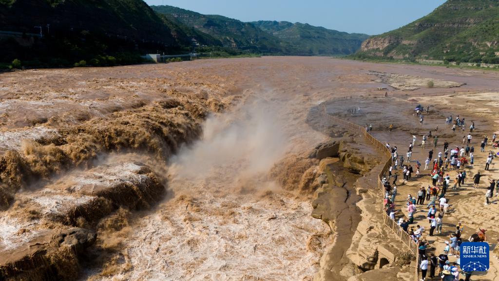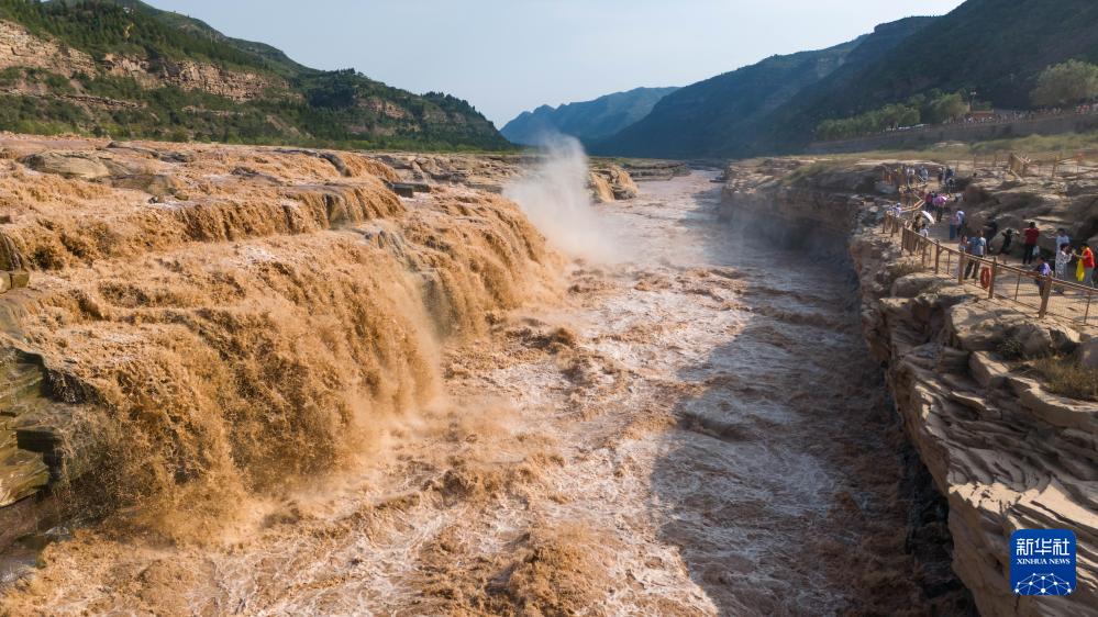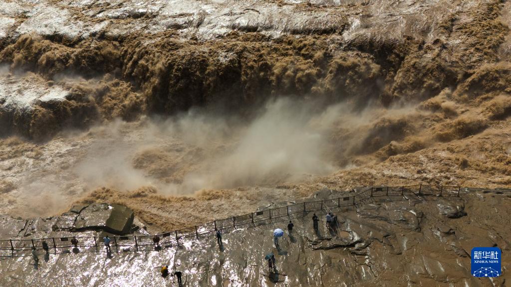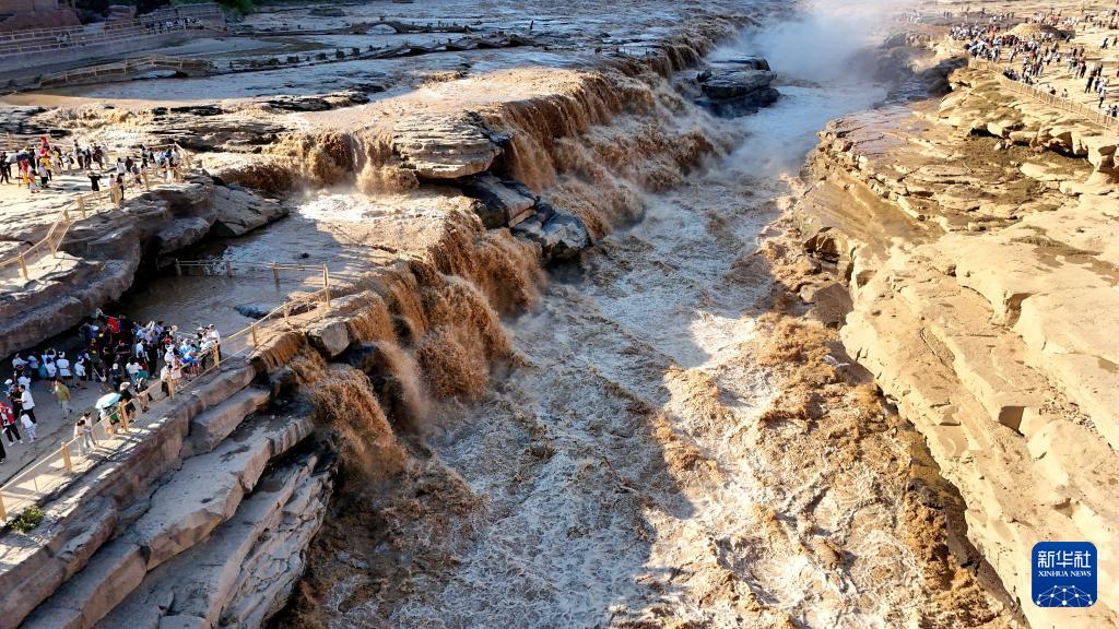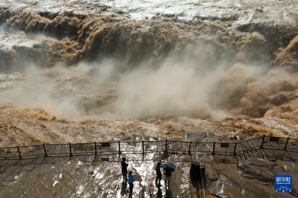 游客在黄河壶口瀑布景区游览(8月29日摄,无人机照片)。(新华社记者 邹竞一 摄)