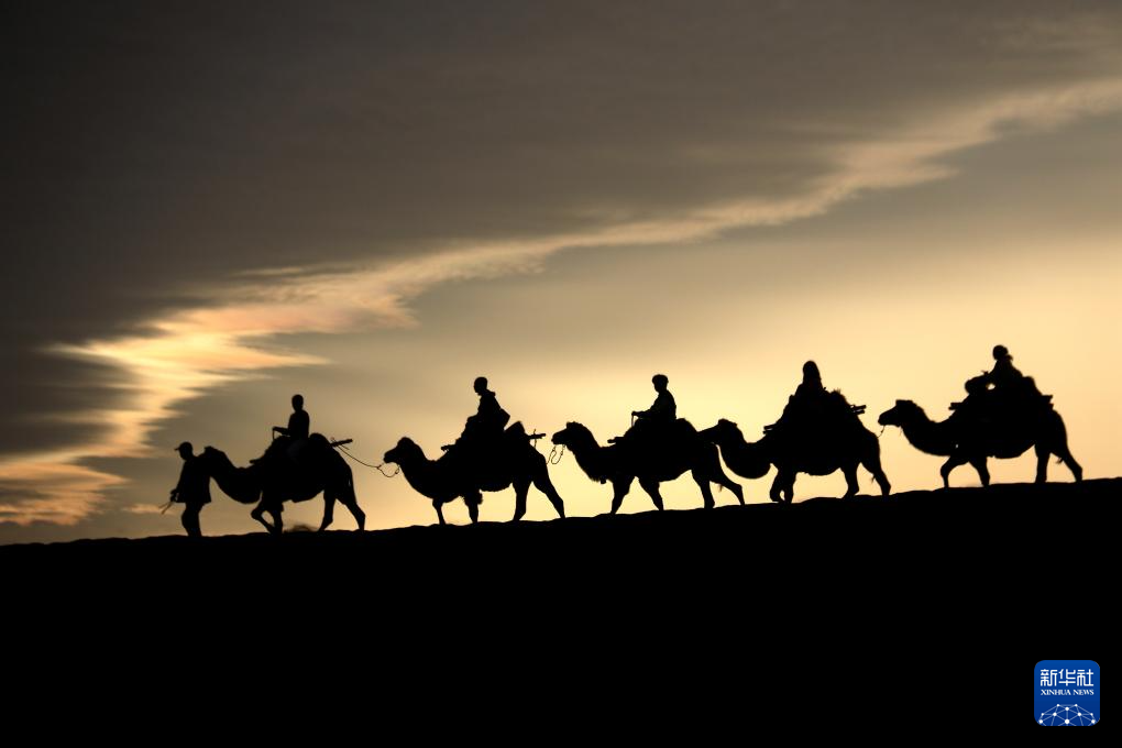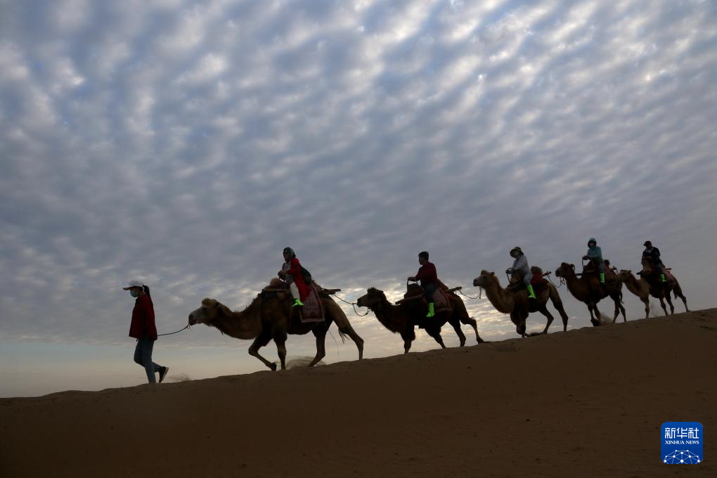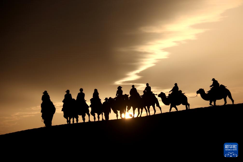9月1日清晨,游客在甘肃省敦煌市鸣沙山月牙泉景区乘骑骆驼,欣赏大漠风光,体验丝路风情。(新华社发 张晓亮 摄)