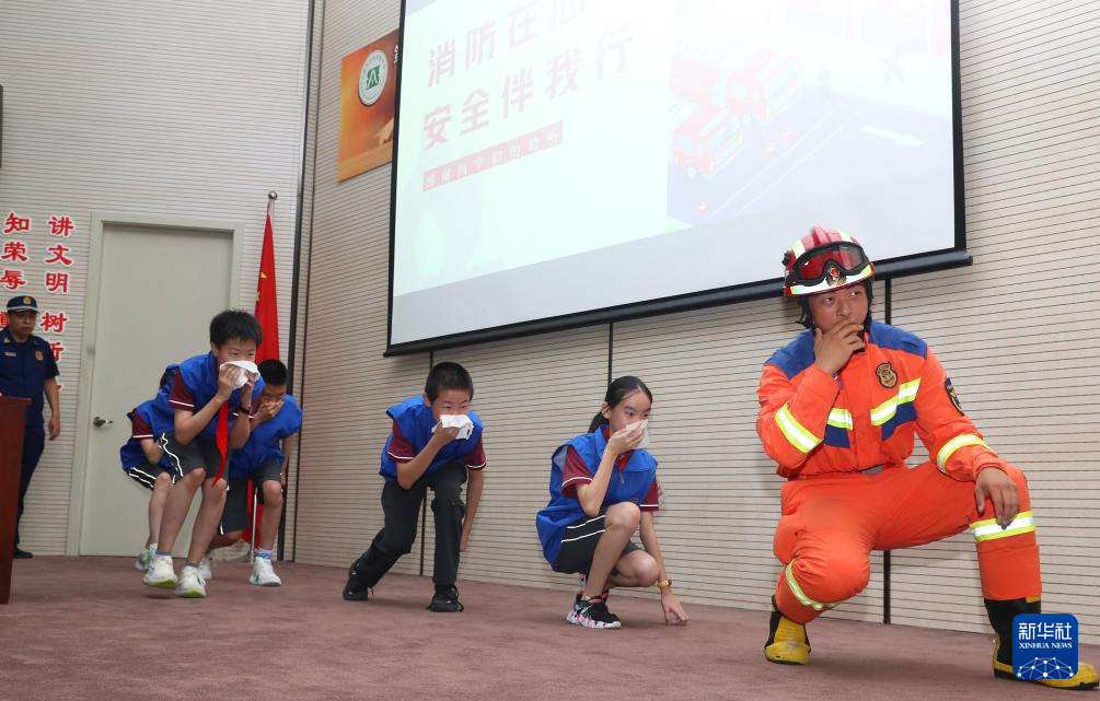 9月2日,上海市长宁区消防救援支队走进上海市延安初级中学,通过结合火场案例的理论知识和消防器材体验等互动环节,为同学们带来一堂生动有趣的“开学第一课”。这是同学们向消防员(右)学习火场的疏散技巧。(新华社记者 方喆 摄)