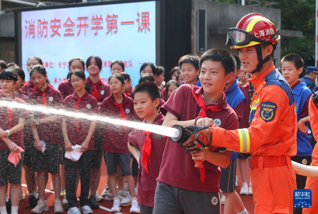 月2日,上海市长宁区消防救援支队走进上海市延安初级中学,通过结合火场案例的理论知识和消防器材体验等互动环节,为同学们带来一堂生动有趣的“开学第一课”。这是消防员(右)在辅助一位同学进行消防水枪的喷水体验。(新华社记者 方喆 摄)