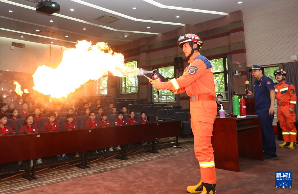 9月2日,上海市长宁区消防救援支队走进上海市延安初级中学,通过结合火场案例的理论知识和消防器材体验等互动环节,为同学们带来一堂生动有趣的“开学第一课”。这是消防员(前)在向同学们演示家用杀虫剂的起火威力。(新华社记者 方喆 摄)