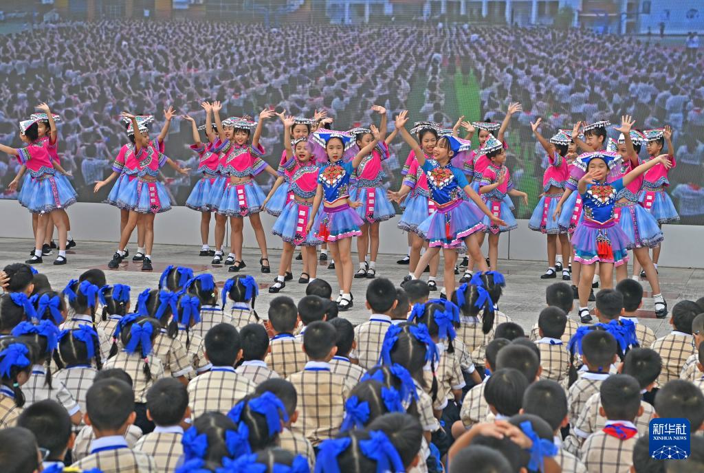 9月2日,孩子们在广西南宁市滨湖路小学举行的主题为“民族团结一家亲 童心共筑中国梦”的2024年秋季学期开学仪式上表演节目。(新华社记者 周华 摄)