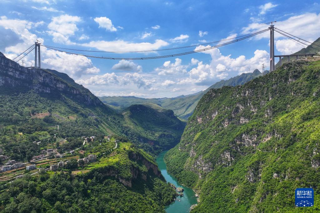 这是建设中的花江峡谷大桥(无人机照片,9月3日摄)。(新华社记者 欧东衢 摄)