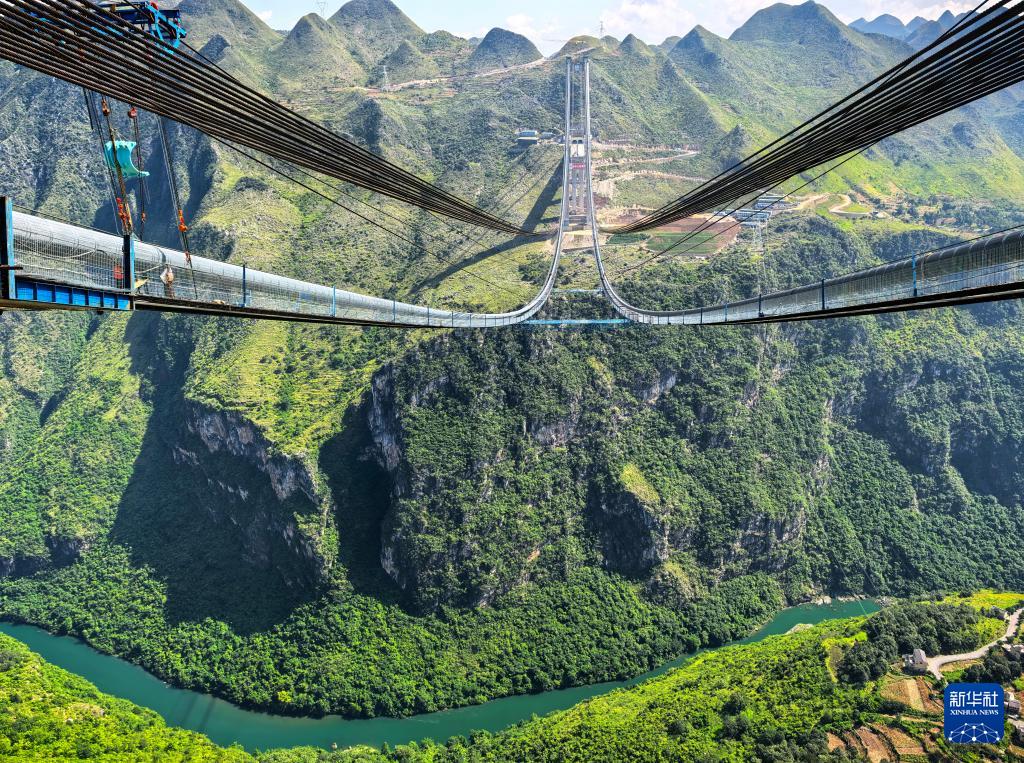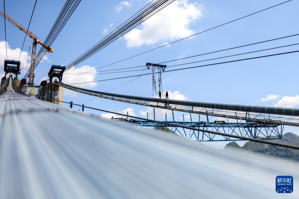 9月4日,建筑工人在花江峡谷大桥的猫道上施工。(新华社记者 欧东衢 摄)