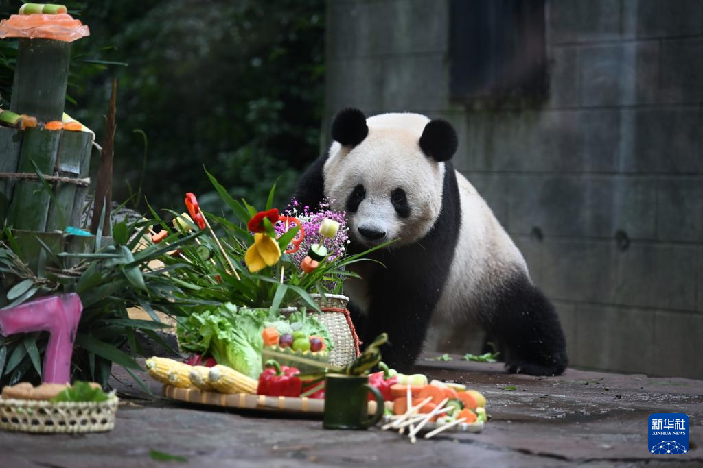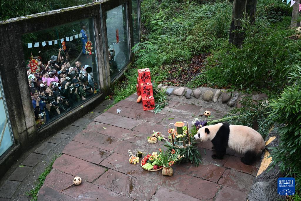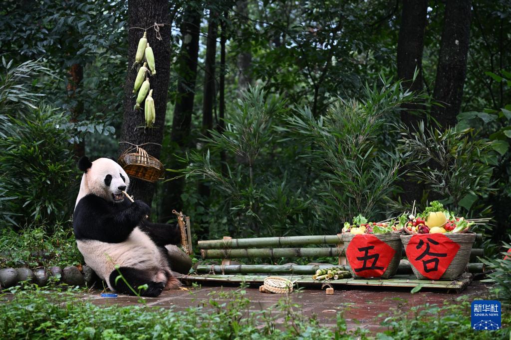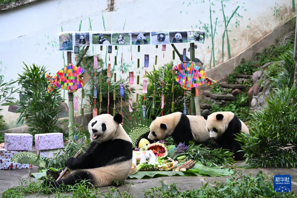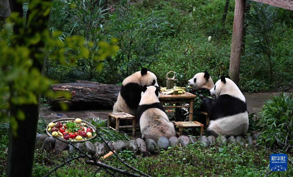 9月13日,中国大熊猫保护研究中心雅安基地为近期过生日的熊猫准备了一场集体生日会,饲养员们结合中秋节主题,精心准备了月饼窝窝头、水果拼盘、竹笋蛋糕及茶具茶桌等。