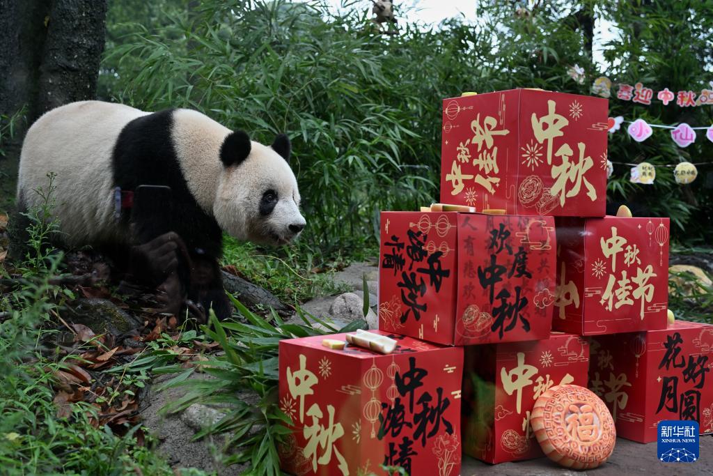 9月13日,大熊猫“香香”走向中秋礼盒。(新华社记者 薛晨 摄)