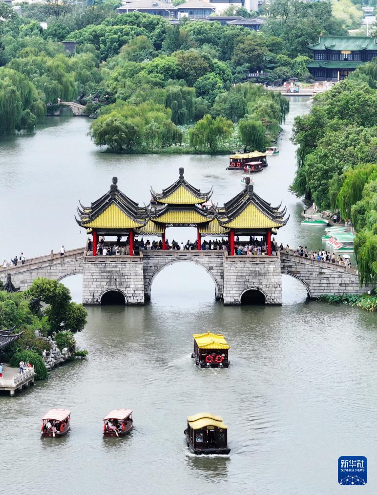 9月17日,游客在江苏扬州瘦西湖风景区游玩(无人机照片)。(新华社发 孟德龙 摄)