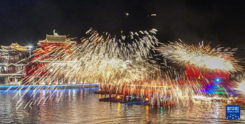 9月16日晚,民间艺人在河北省唐山市丰南区河头老街景区为游客表演打铁花(无人机照片)。(新华社发 刘满仓 摄)