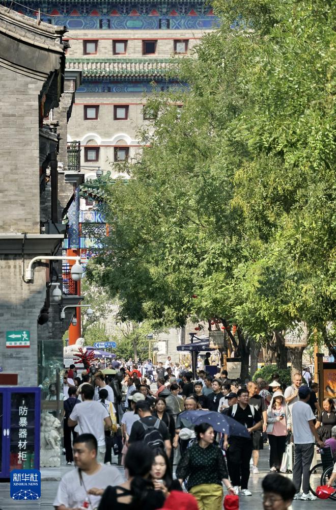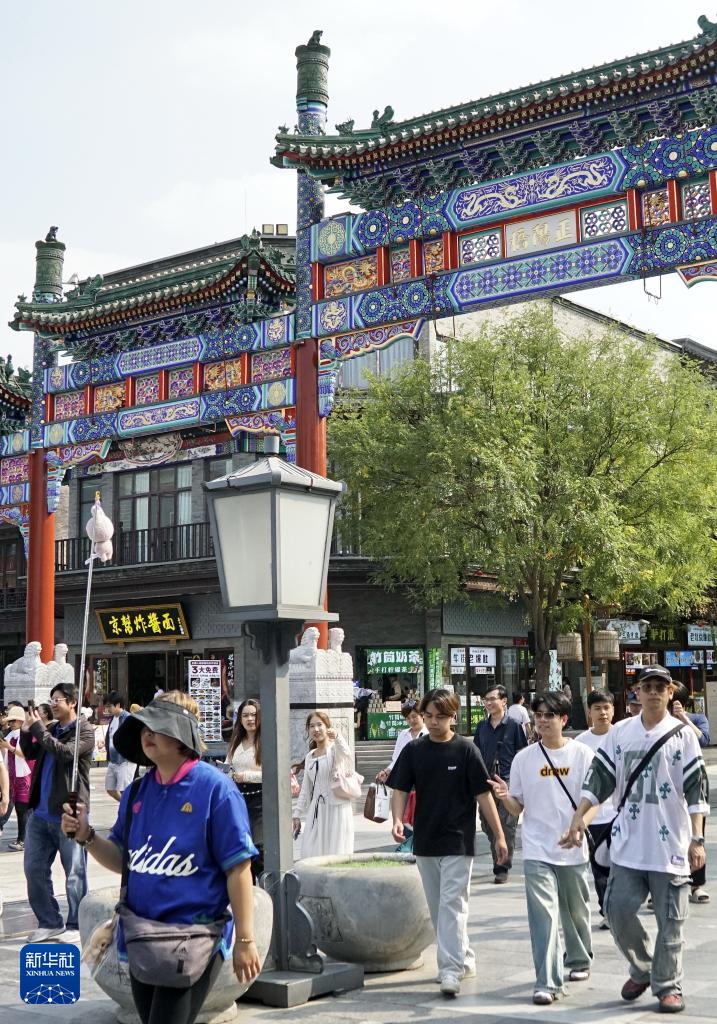 9月19日,来自全国各地的游客在前门大街游览。(新华社记者 李欣 摄)