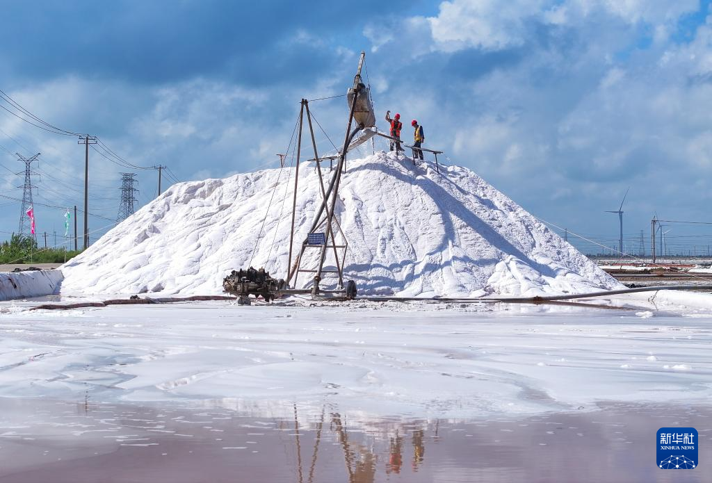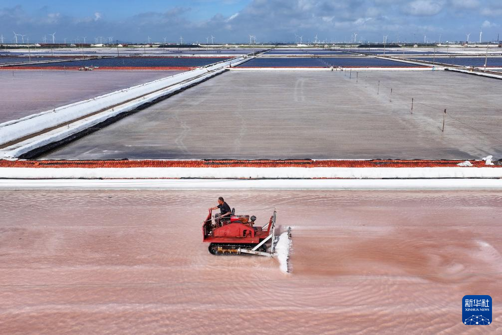 连日来,江苏省连云港市灌西盐场盐田进行秋季扒盐作业,工人们利用晴好天气加紧扒盐,盐场呈现一派丰收景象。