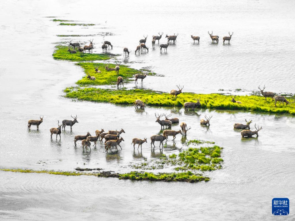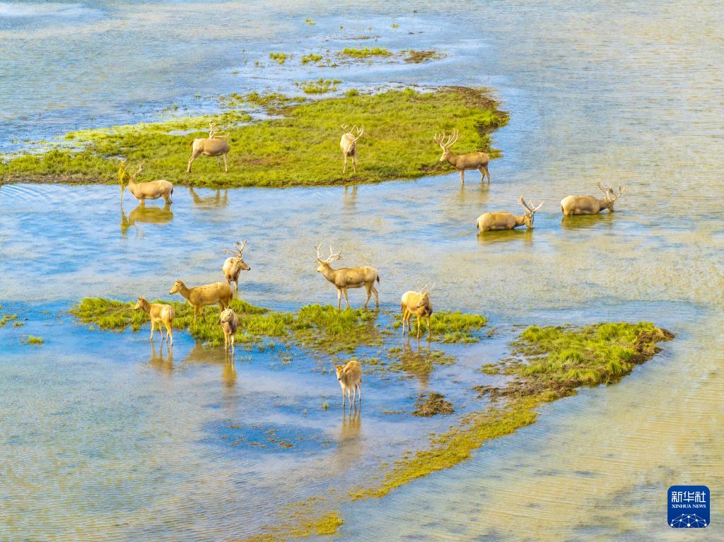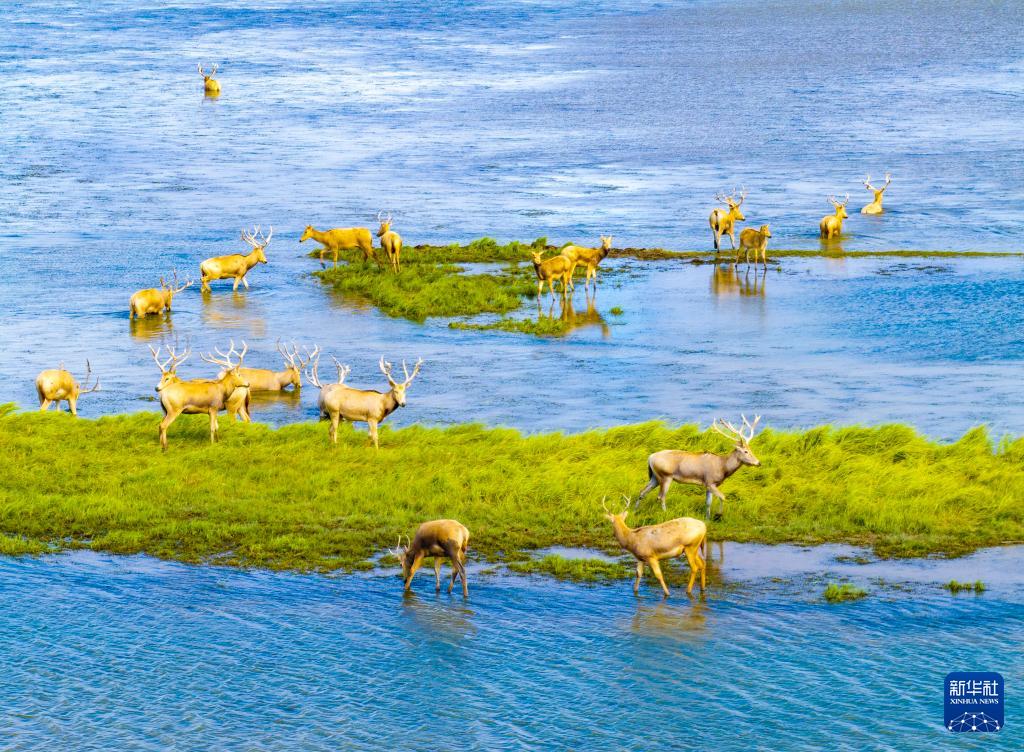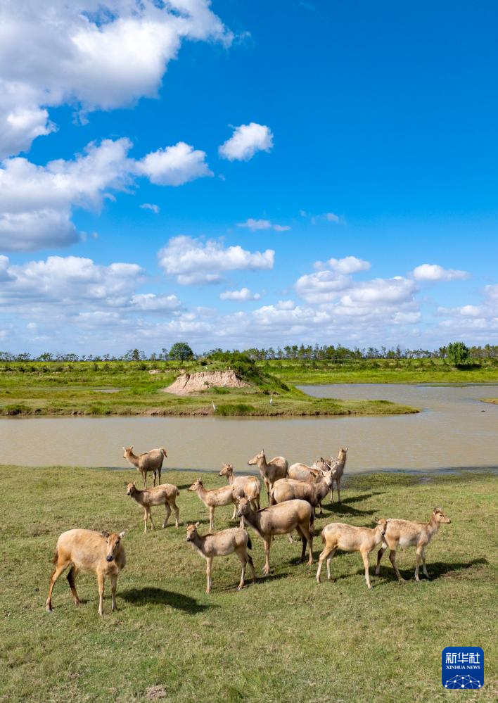 近年来,随着生态环境持续改善,江苏省盐城市大丰区的黄海野鹿荡麋鹿种群保持健康稳定增长。野鹿荡水草丰美,成群的麋鹿嬉戏、觅食,构成一幅美丽的秋日生态画卷。