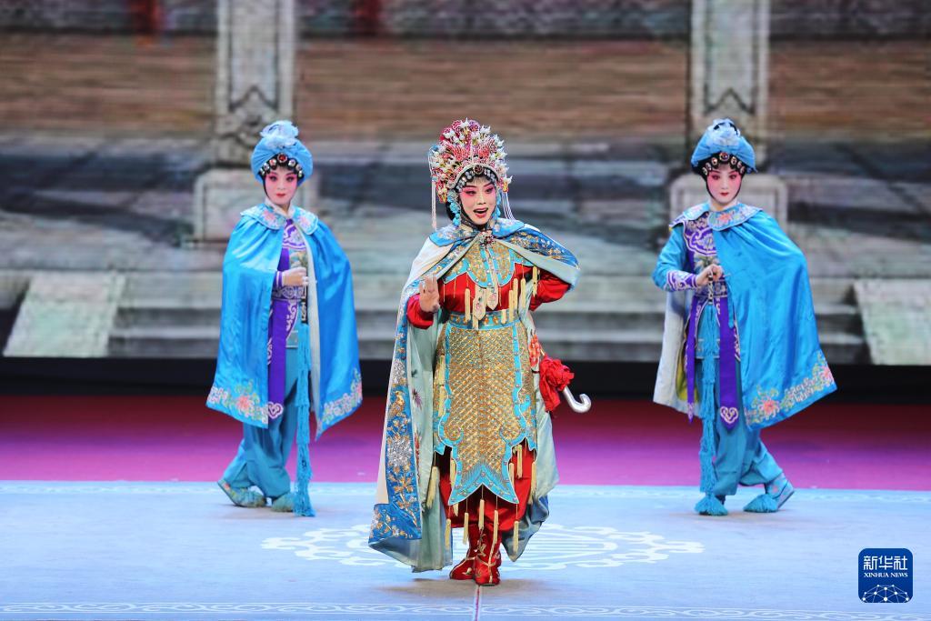9月21日,参赛者杨丽丽(中)在甘肃省白银市会宁县表演晋剧《大脚皇后》。(新华社发 王克贤 摄)