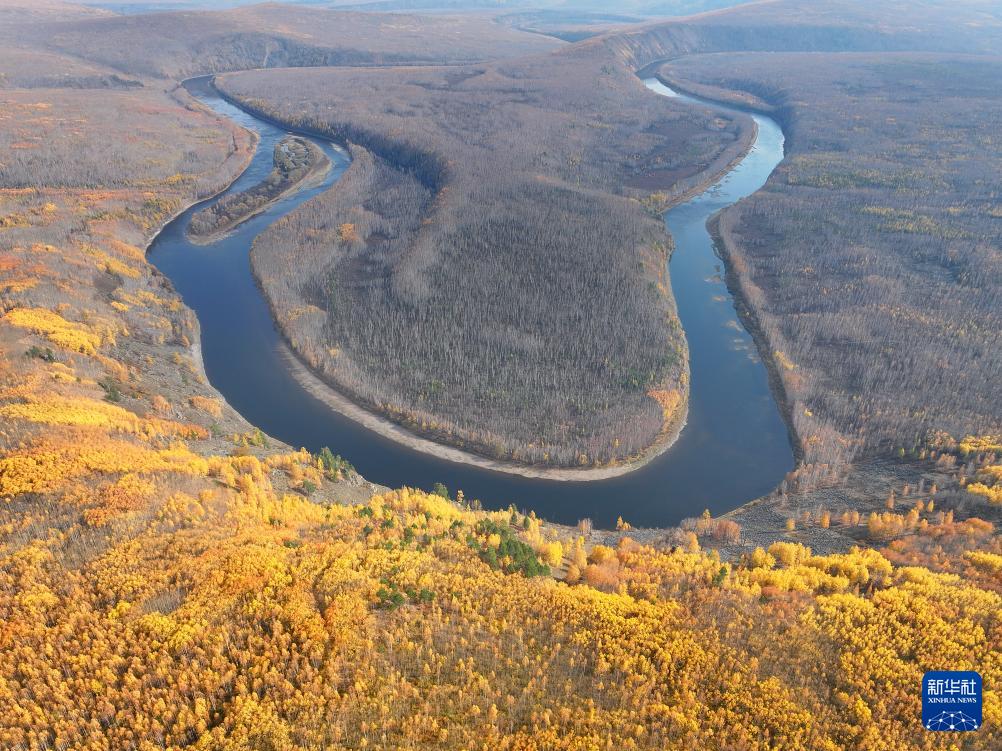 9月23日拍摄的黑龙江省漠河市黑龙江江畔秋景(无人机照片)。(新华社发 许丛军 摄)