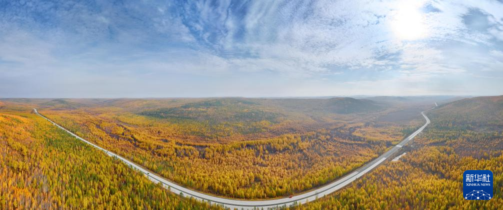 9月23日拍摄的黑龙江省漠河市境内一条公路“分割”秋色(无人机全景照片)。(新华社发 许丛军 摄)