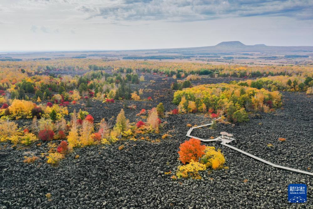 9月24日,游客在五大连池世界地质公园内观赏秋色(无人机照片)。(新华社发 黄宝印 摄)