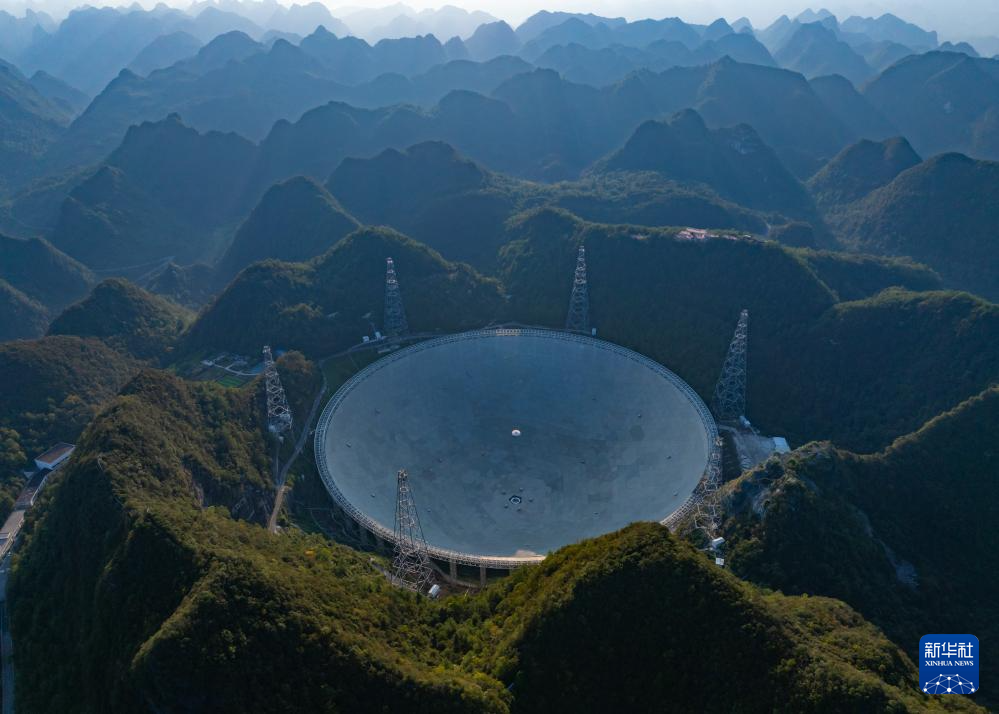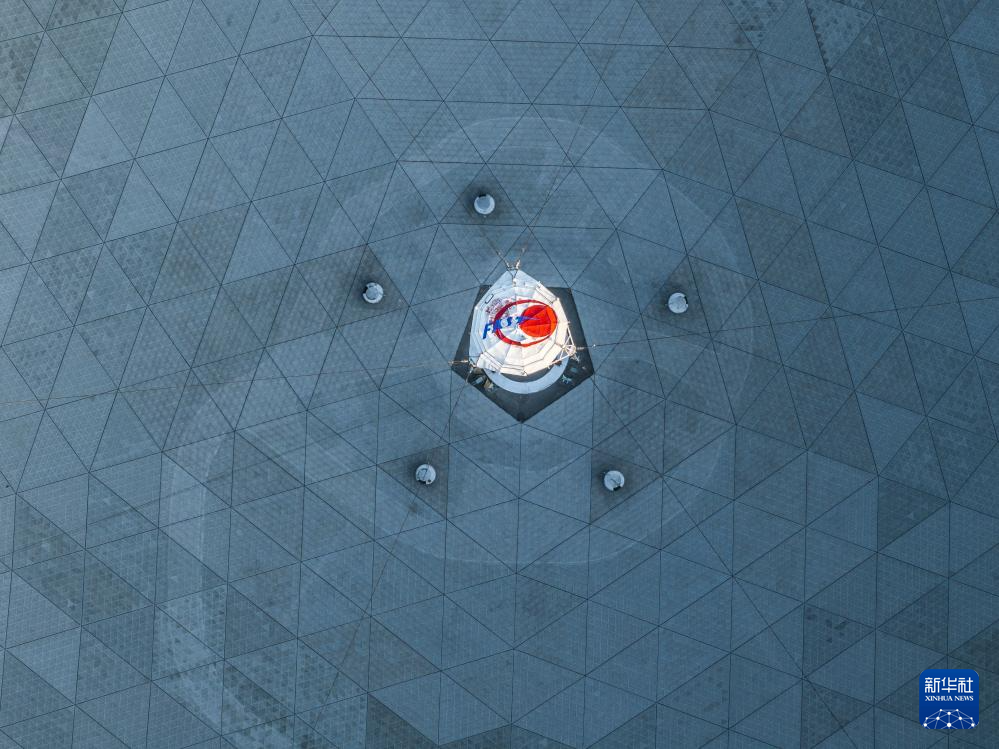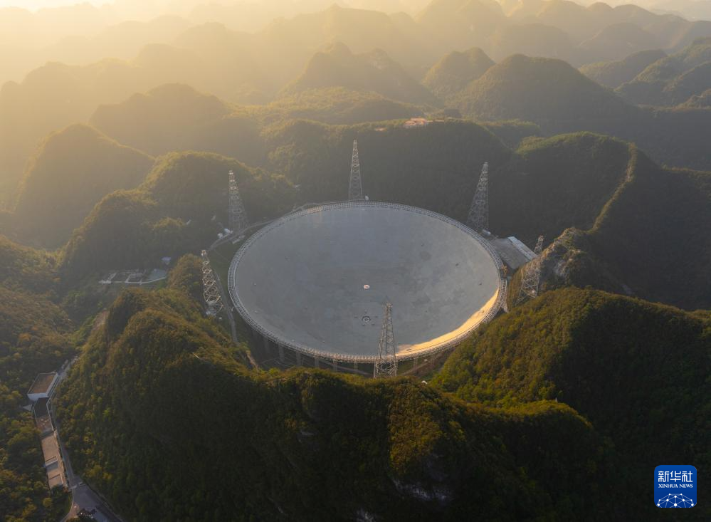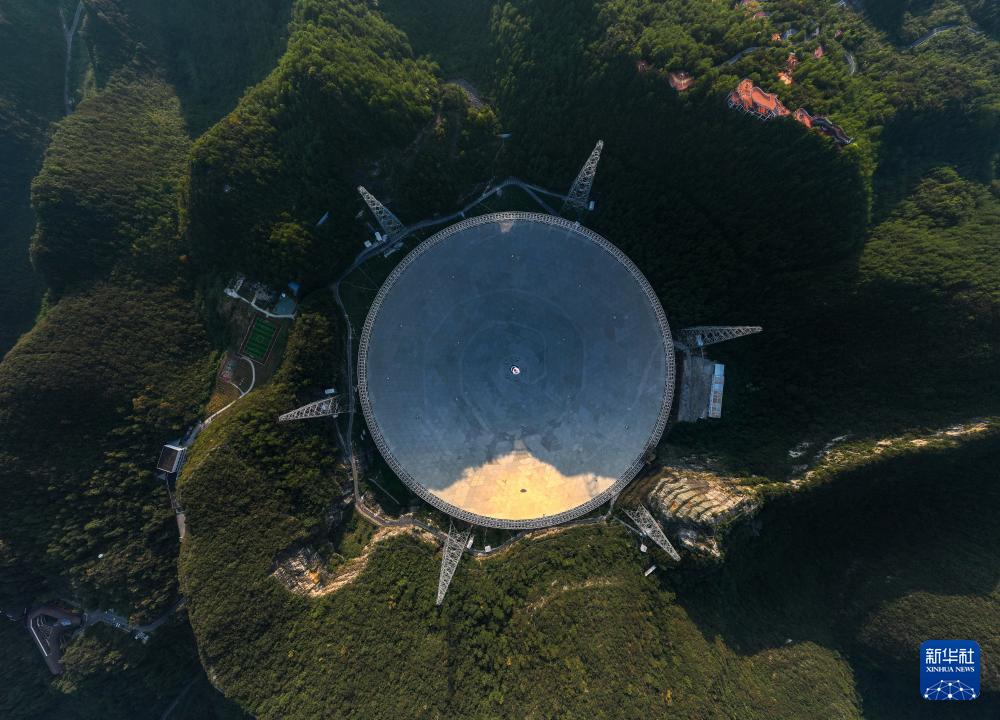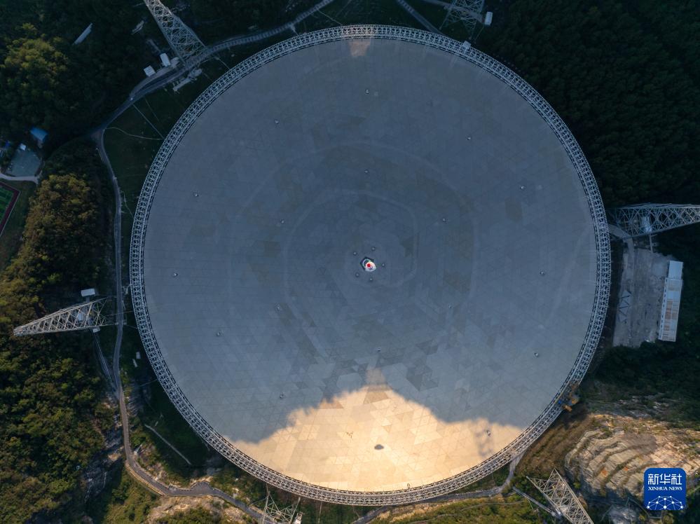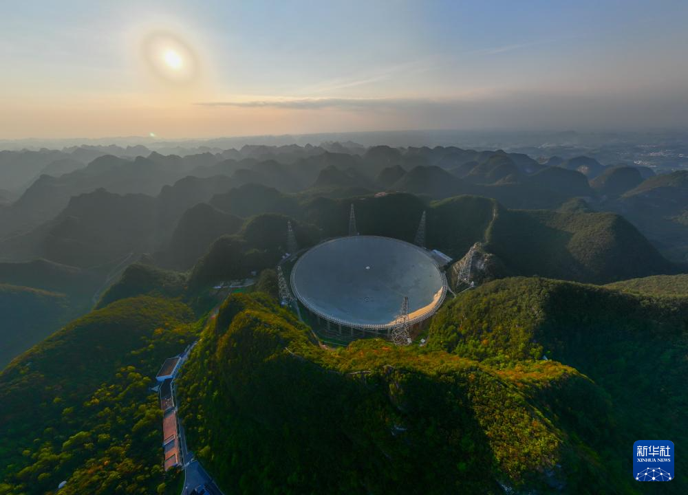 中国天眼在落日余晖中(无人机照片,维护保养期间拍摄,9月25日摄)。(新华社记者 刘续 摄)