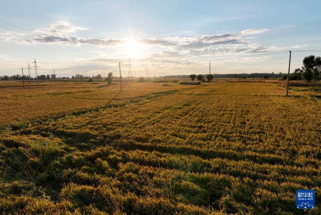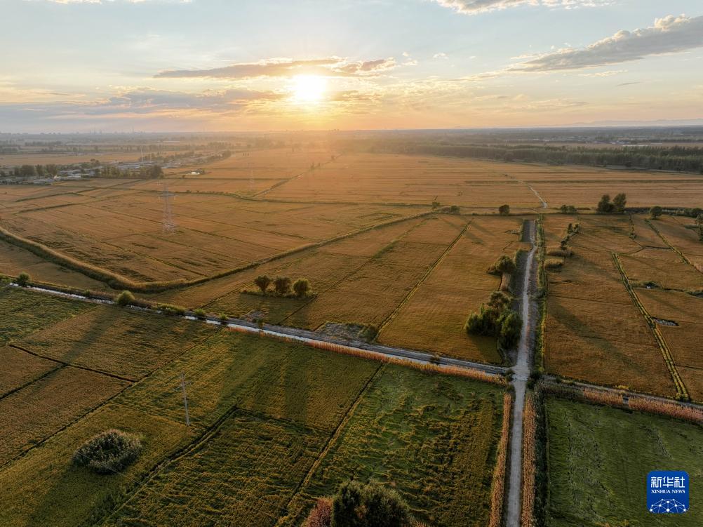 落日余晖映照辽宁盘锦的稻田(9月25日摄,无人机照片)。(新华社记者 李钢 摄)