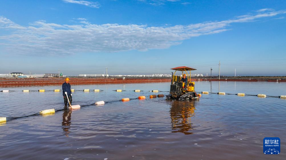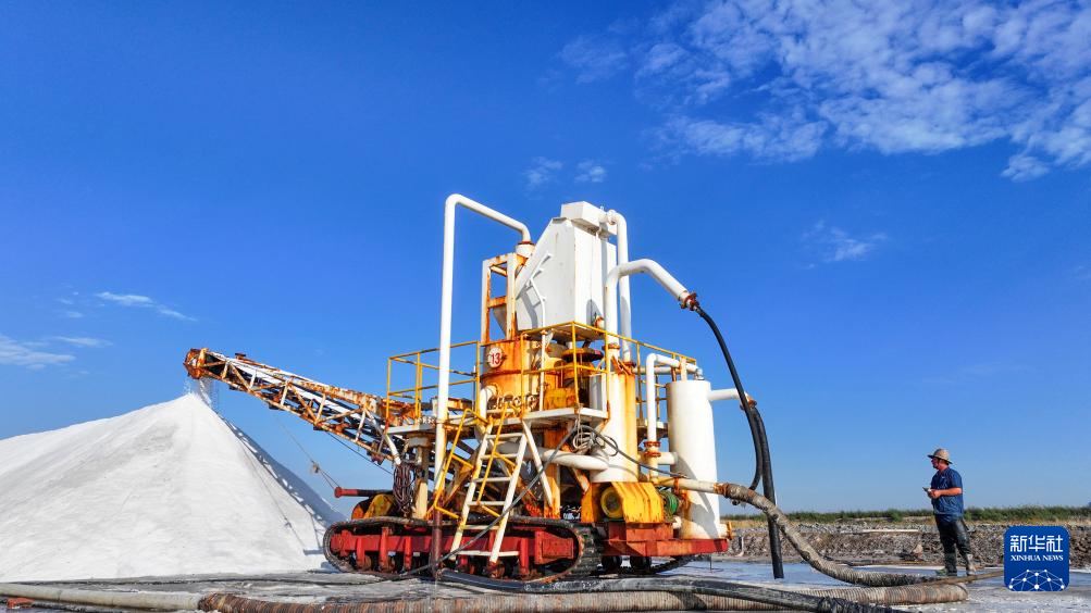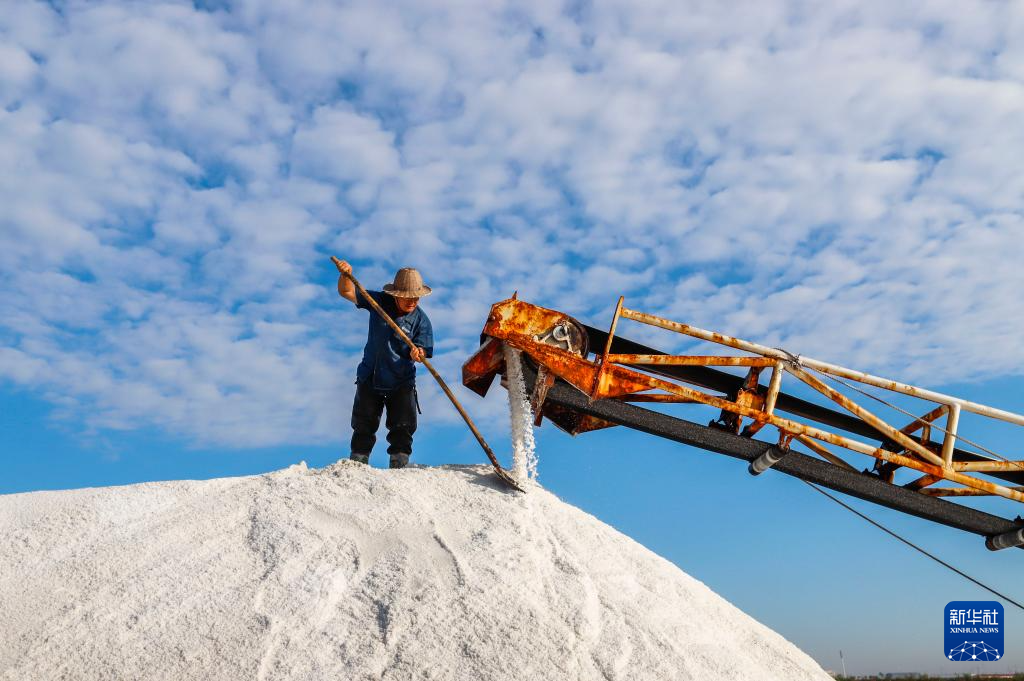秋日,河北省唐山市海港经济开发区长芦大清河盐场天高云淡,工人们利用晴好天气加紧收获秋盐,盐田一片忙碌景