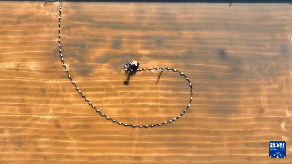 9月26日,工人在唐山海港经济开发区长芦大清河盐场收获秋盐(无人机照片)。(新华社发 刘满仓 摄)