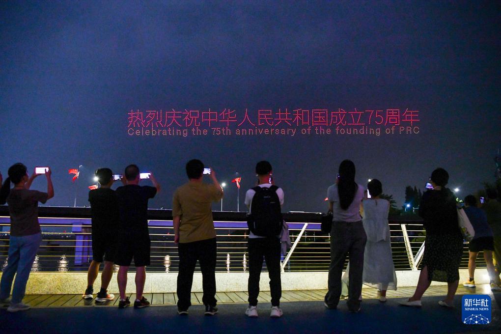 9月26日,市民、游客在深圳湾观看无人机表演。(新华社记者 梁旭 摄)
