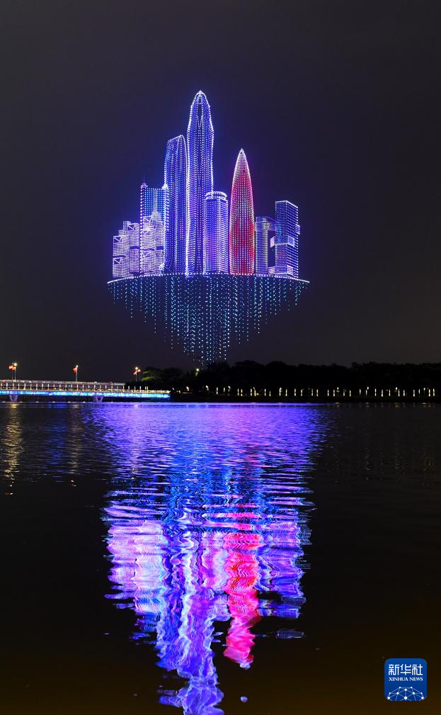 9月26日,无人机在深圳湾上空组成深圳市地标建筑物图案。(新华社记者 毛思倩 摄)