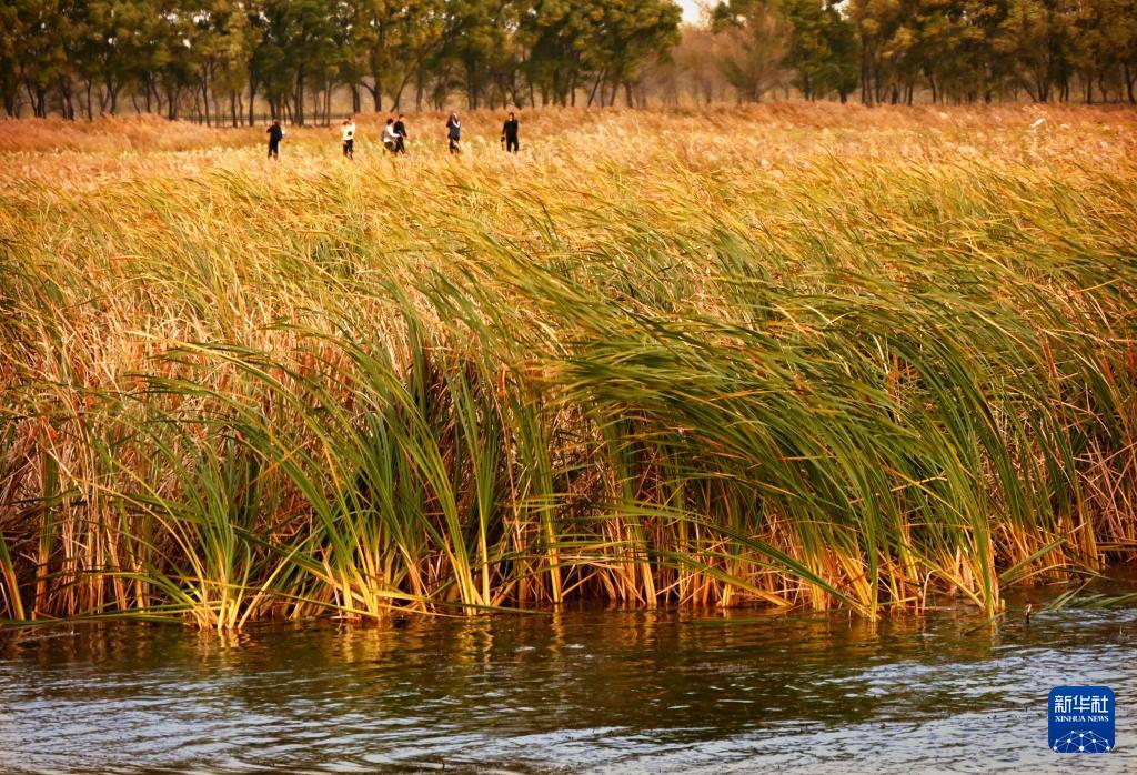 10月10日,游人在富锦国家湿地公园的芦苇丛中游玩拍照。(新华社发 王颂 摄)