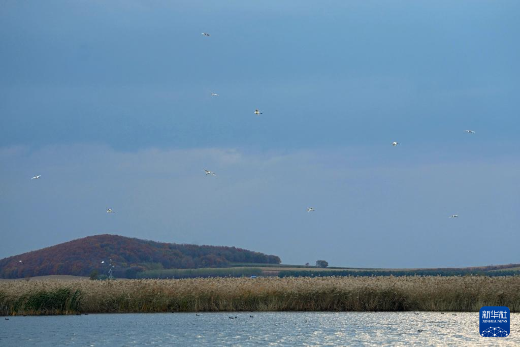 10月10日,水鸟在富锦国家湿地公园上空飞翔。(新华社记者 刘颖 摄)