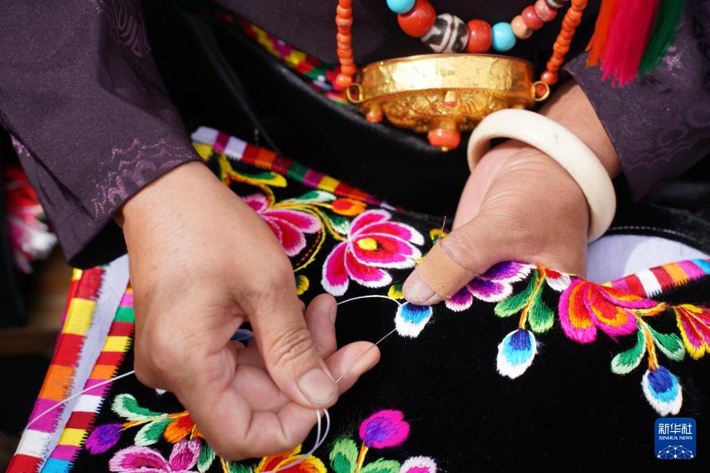 10月12日,嘉绒藏族刺绣甘孜州非遗传承人阿姆在四川省丹巴县巴底镇色足村绣花。(新华社发 吕明响 摄)