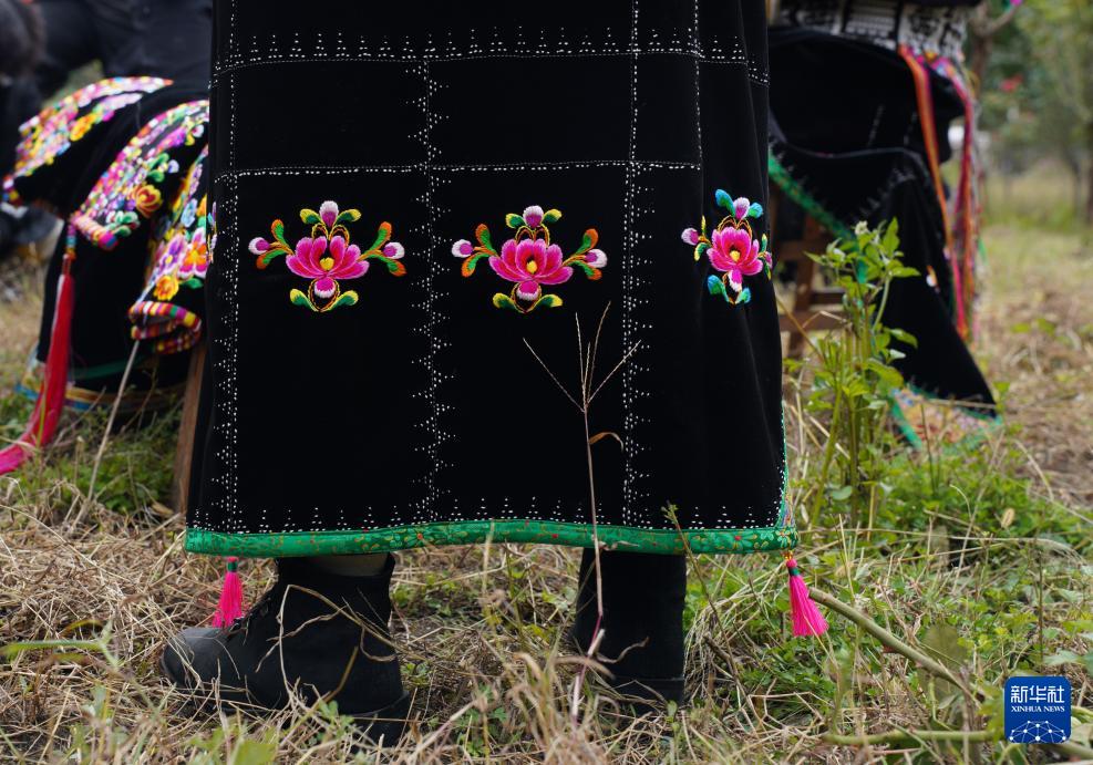 这是10月12日在四川省甘孜藏族自治州丹巴县巴底镇色足村拍摄的嘉绒藏族刺绣后围裙局部。(新华社发 吕明响 摄)