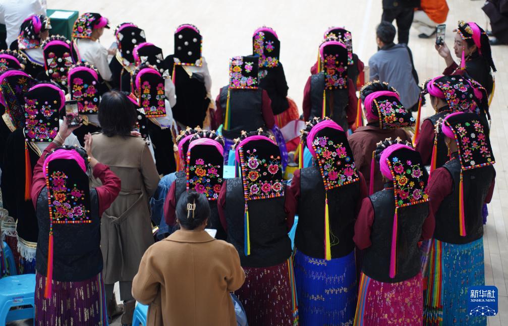 10月11日,佩戴藏族刺绣头帕的妇女在四川省丹巴县县城参加活动。(新华社发 吕明响 摄)