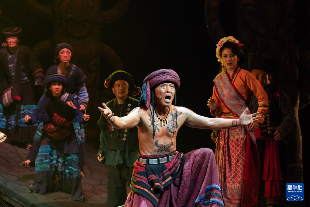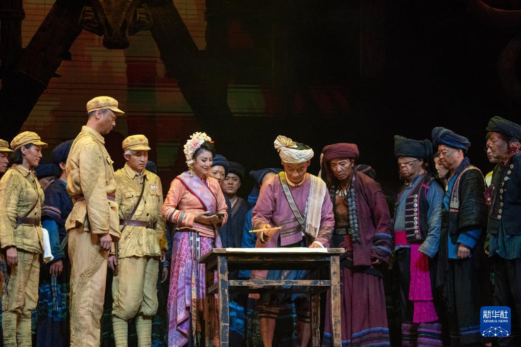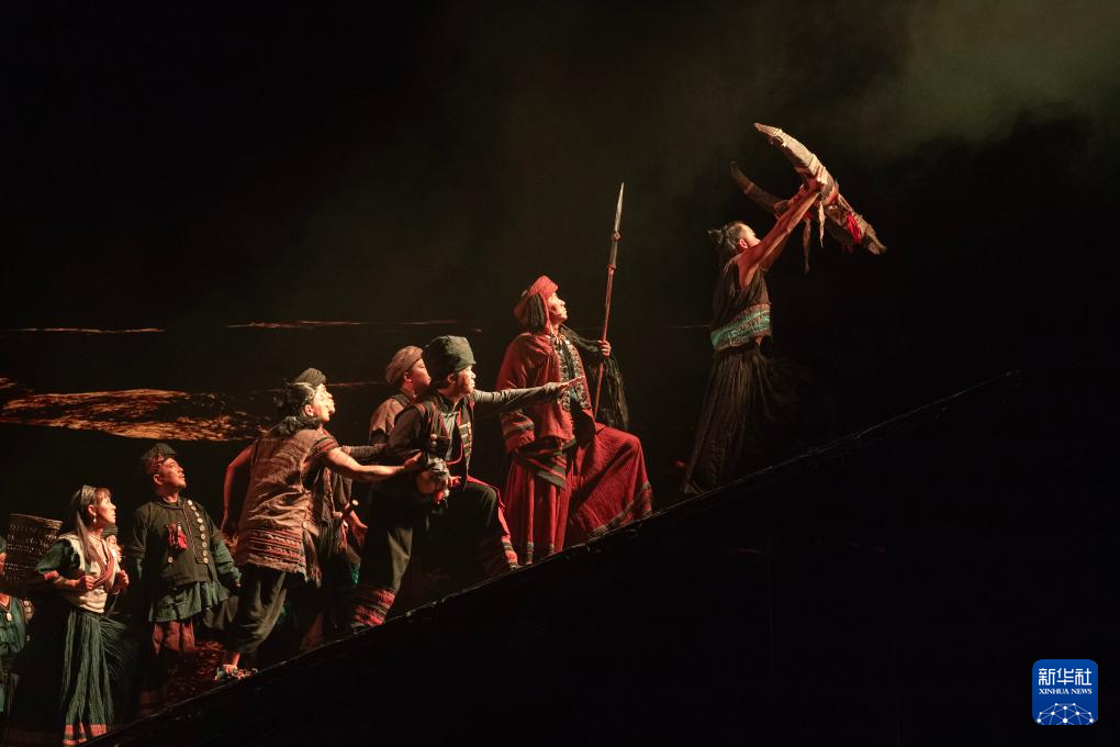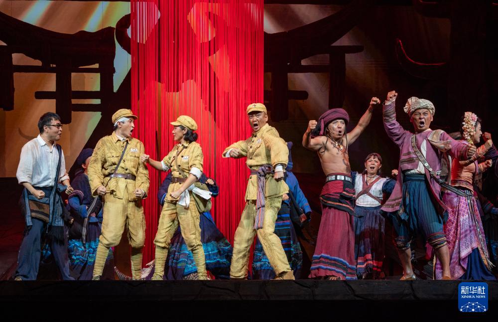 10月13日晚,演员在云南省大剧院表演话剧《澜沧水长》。(新华社记者 陈欣波 摄)