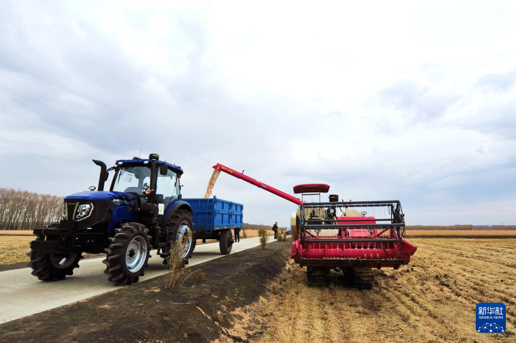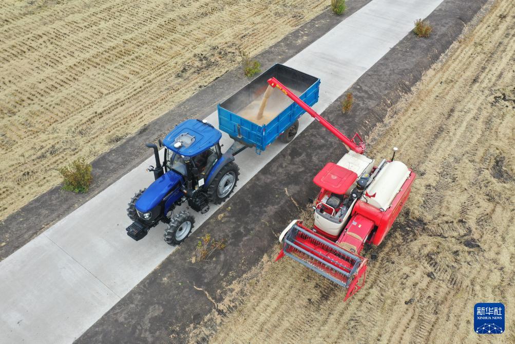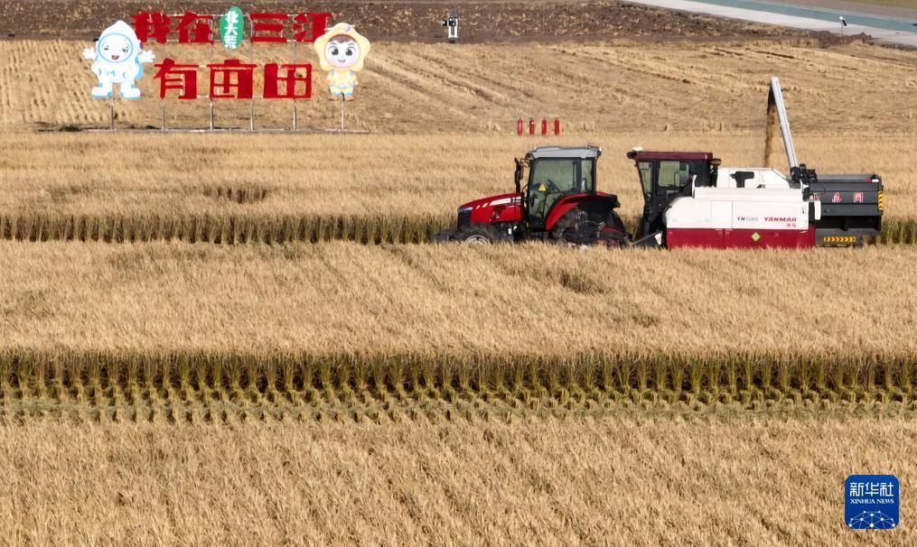 10月14日,在黑龙江北大荒农业股份有限公司友谊分公司科技园区内,无人驾驶收获机在工作。(新华社发 徐宏宇 摄)