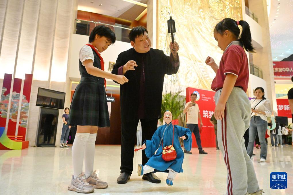 10月21日,一名表演者在开幕式会场外与观众互动。(新华社记者 林善传 摄)