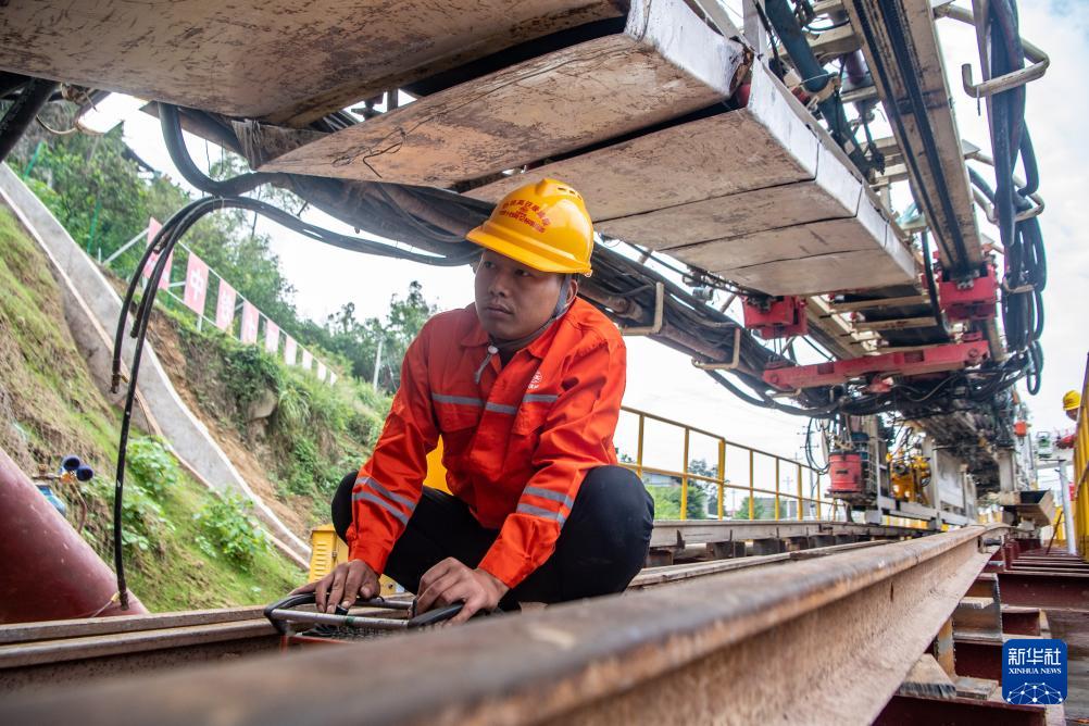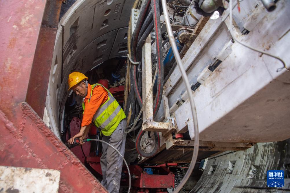 10月22日,在西渝高铁重庆段建设施工现场,工人在盾构机上作业。(新华社记者 唐奕 摄)