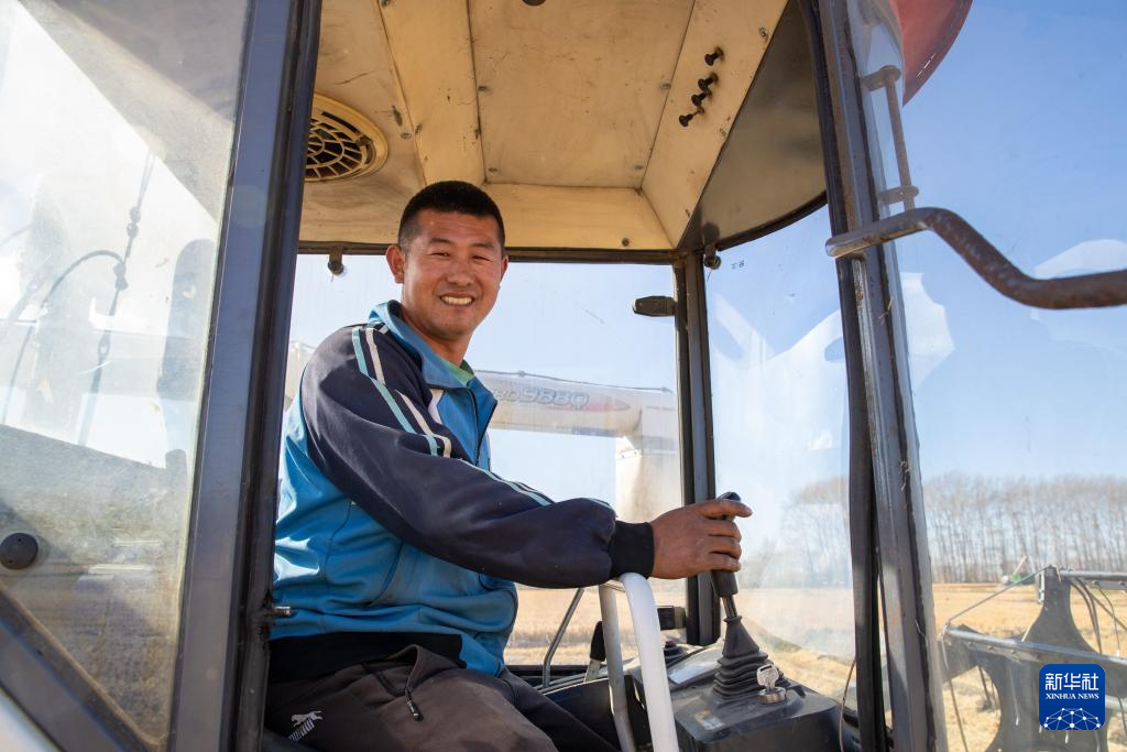 10月12日,北大荒集团普阳农场有限公司作业区,种植户冷立春在农机上。(新华社记者 张涛 摄)