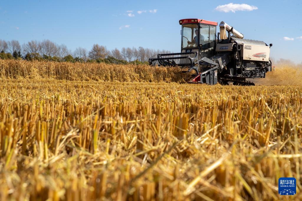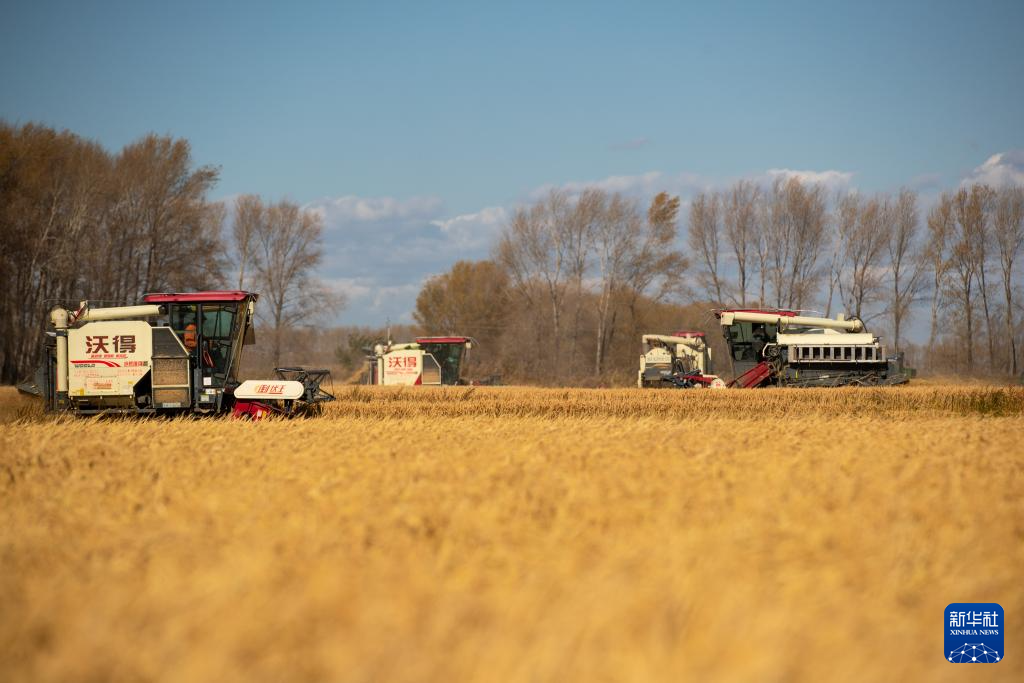 10月12日,北大荒集团普阳农场有限公司作业区,种植户驾驶农机进行收割作业。(新华社记者 张涛 摄)