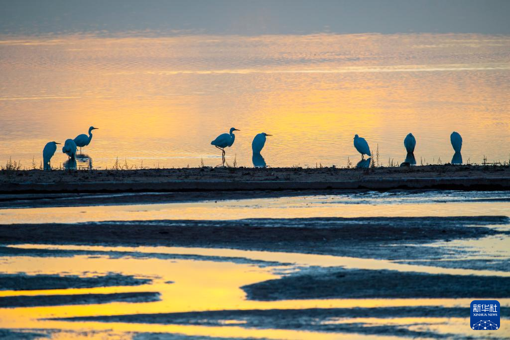10月29日,在甘肃省酒泉市阿克塞哈萨克族自治县境内的冬不拉水库,白鹭在夕阳下歇息漫步。(新华社发 高宏善 摄)