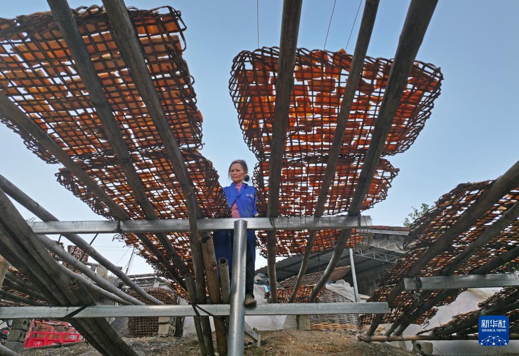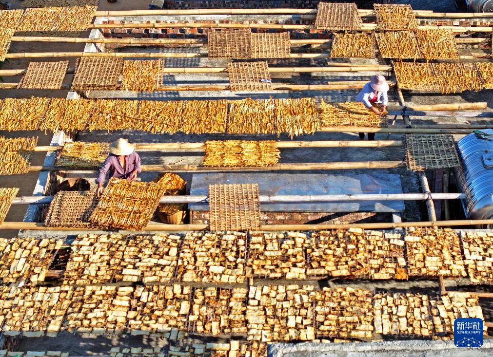 10月31日,村民在广西百色市田林县六隆镇列屯村晾晒八渡笋(无人机照片)。(新华社记者 周华 摄)