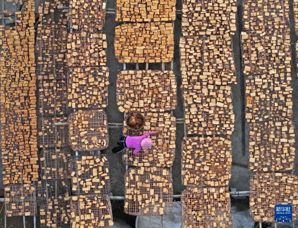 这是广西百色市田林县六隆镇列屯村晾晒八渡笋的场景(10月31日摄,无人机照片)。(新华社记者 周华 摄)