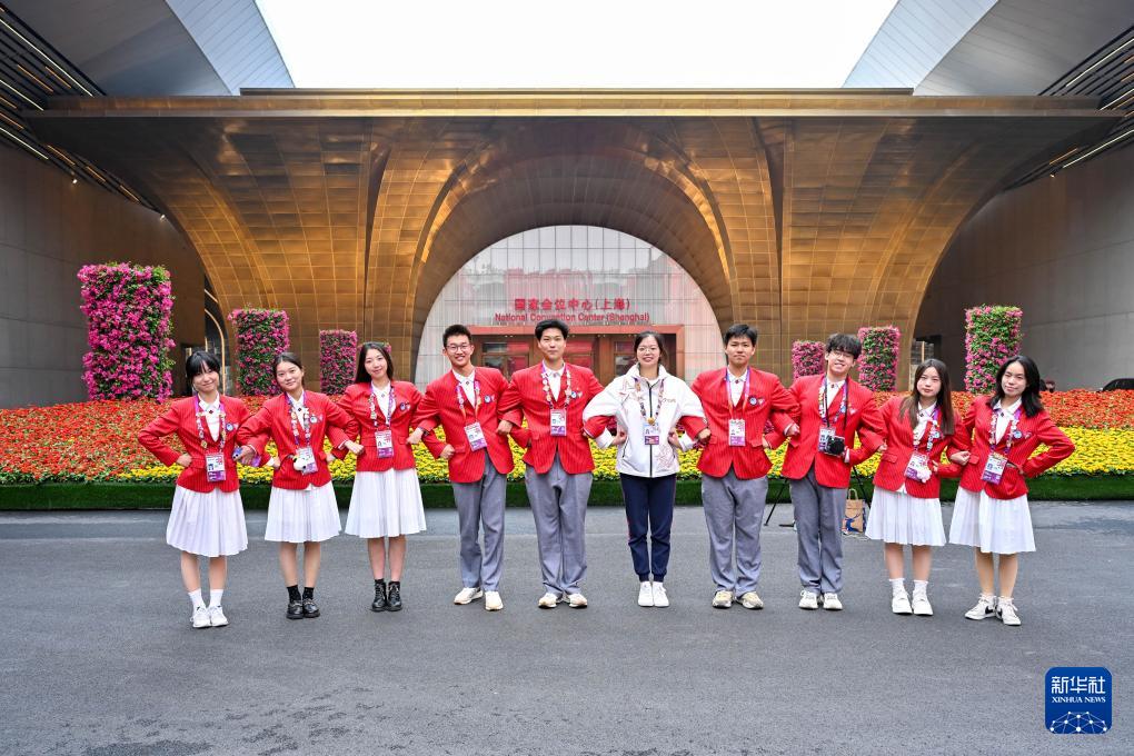 11月4日,志愿者在第七届中国国际进口博览会举办场地——国家会展中心(上海)合影。(新华社记者 张铖 摄)