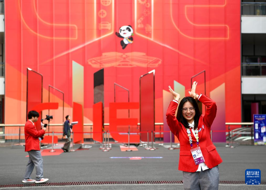 11月4日,志愿者在第七届中国国际进口博览会举办场地——国家会展中心(上海)留影。(新华社记者 金马梦妮 摄)