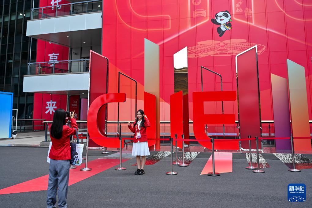 11月4日,志愿者在第七届中国国际进口博览会举办场地——国家会展中心(上海)留影。(新华社记者 张铖 摄)