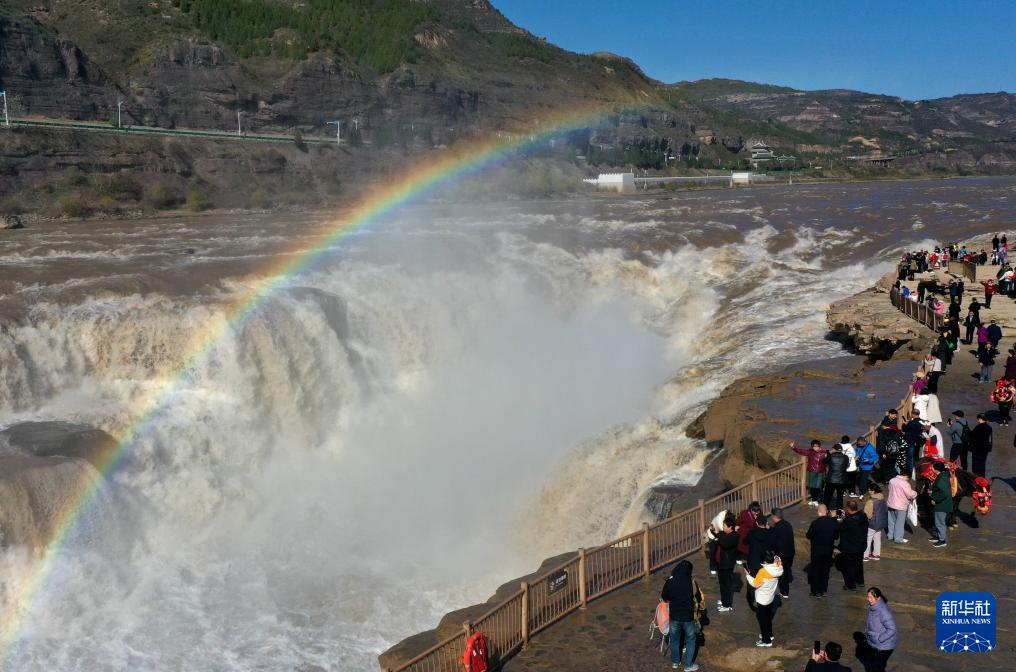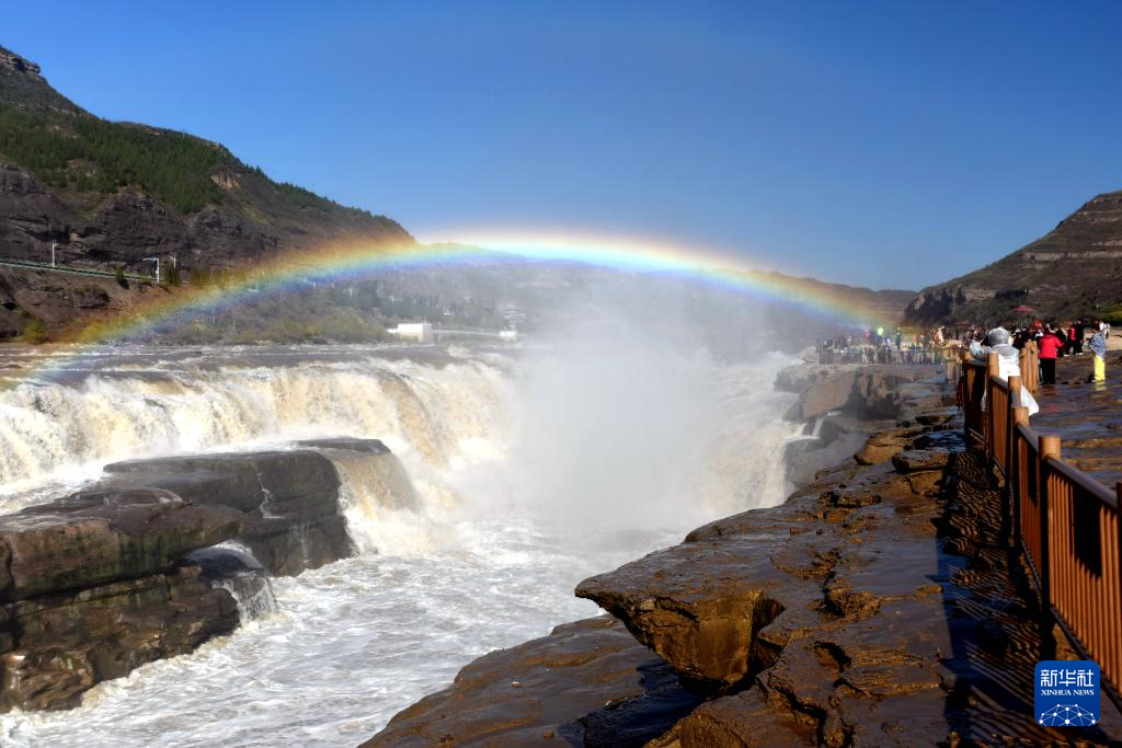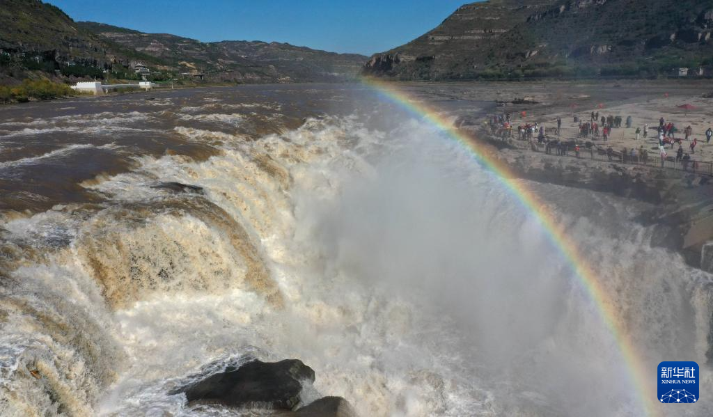深秋时节,受水库调节放水影响,位于山西吉县和陕西宜川县交界的黄河壶口瀑布水量增大,飞溅的水雾在阳光的照射下,形成“彩虹桥”景观。