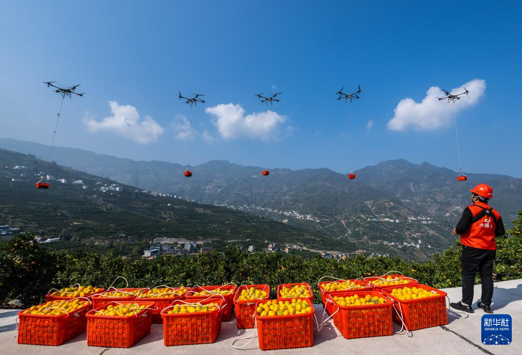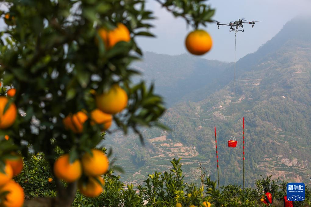 11月5日,秭归县脐橙社会化服务队技术人员在郭家坝镇熊家岭村果园里进行无人机转运脐橙表演。(新华社发 郑家裕 摄)