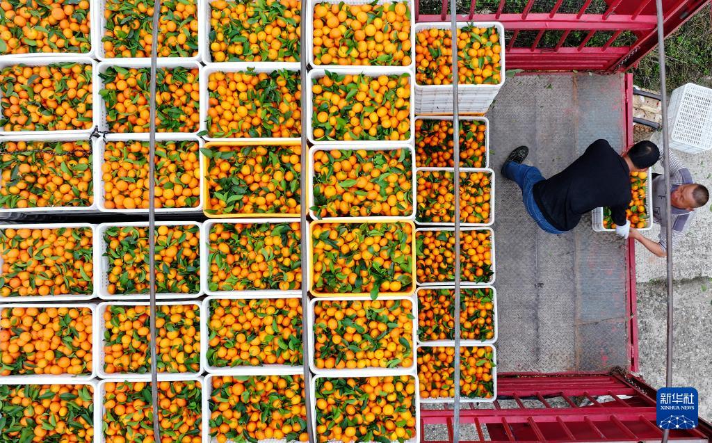 11月6日,在四川省南充市蓬安县相如街道塔子山万亩柑橘产业园,果农将刚采摘的柑橘装车(无人机照片)。(新华社发 刘永红 摄)