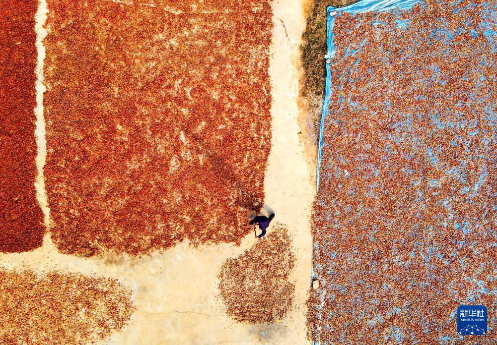 11月6日,山东省临沂市平邑县地方镇农民在晾晒山楂干(无人机照片)。(新华社发 武纪全 摄)
