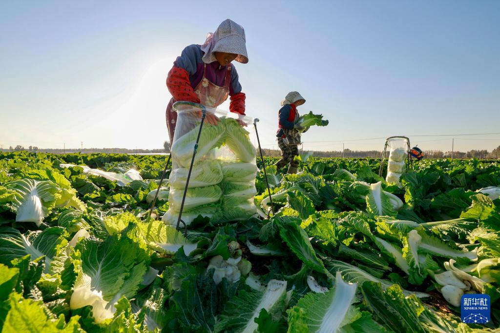 11月6日,河北省唐山市丰南区王兰庄镇一家蔬菜种植合作社的社员在田间收获大白菜。(新华社发 李秀清 摄)