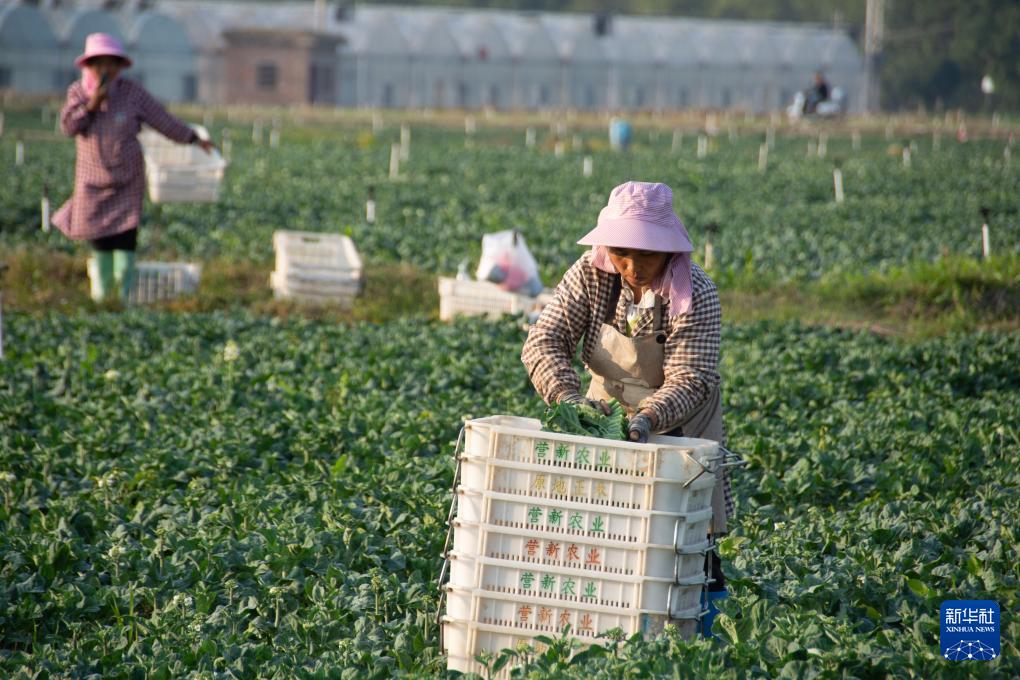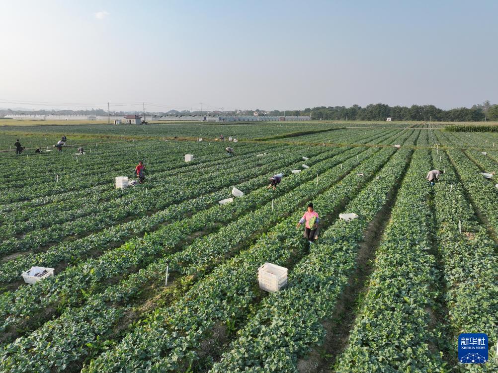 11月6日,村民在湖南省永州市道县清塘镇正禾农场种植基地采收芥蓝。(新华社记者 柳王敏 摄)