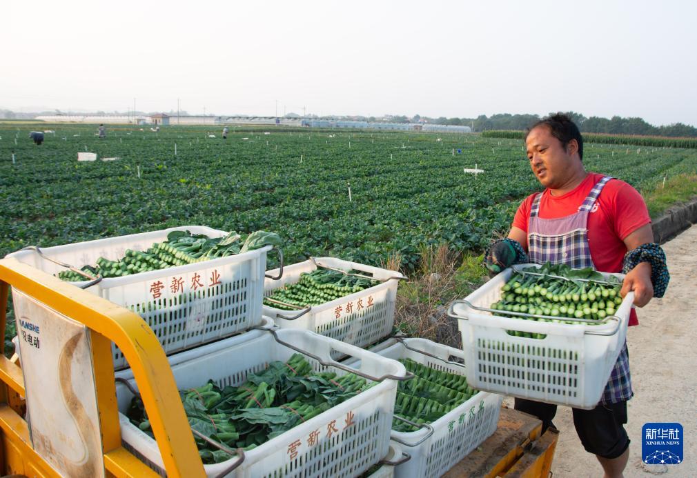 11月6日,村民在湖南省永州市道县清塘镇正禾农场种植基地搬运刚采收的芥蓝。(新华社记者 柳王敏 摄)