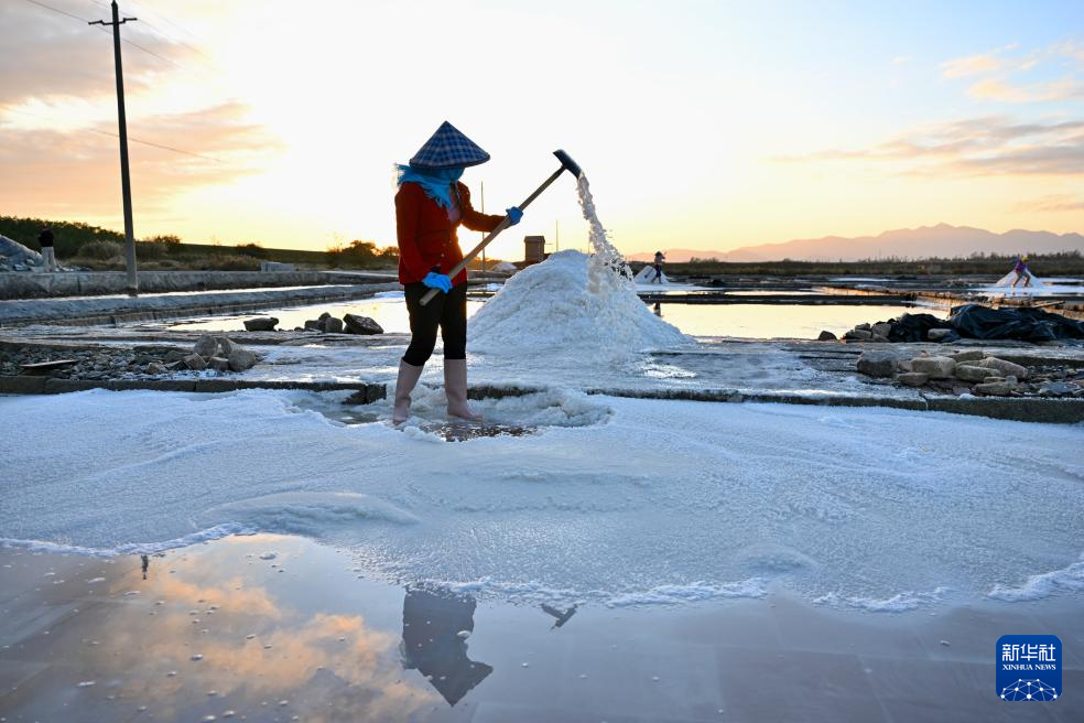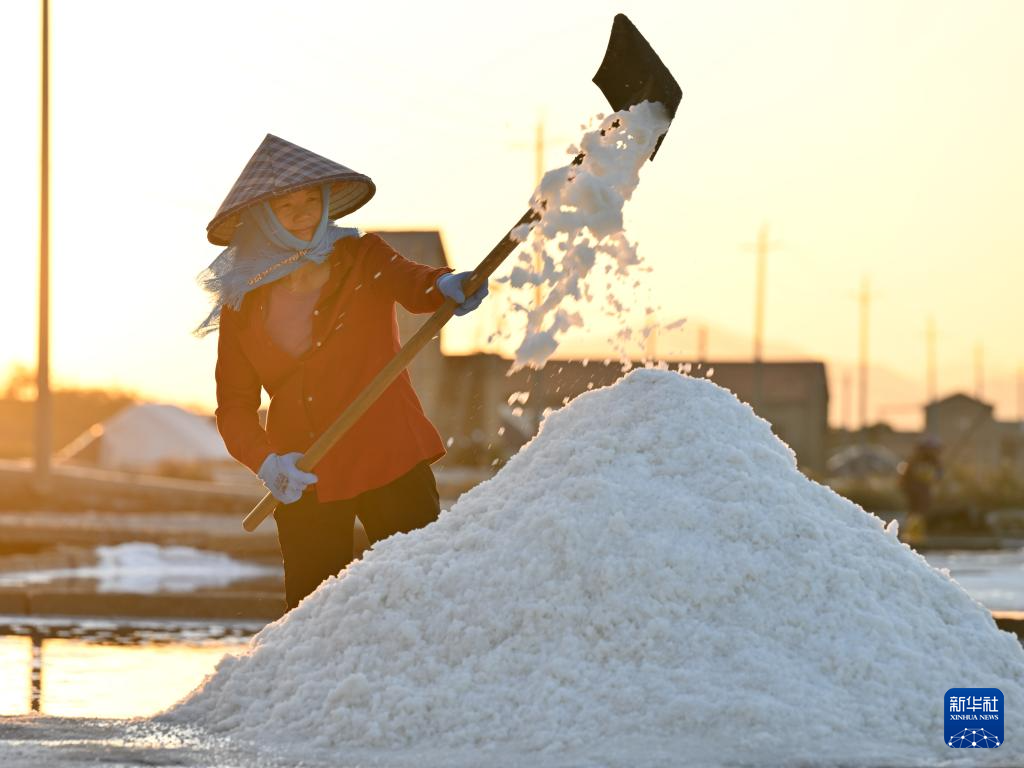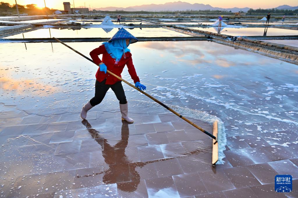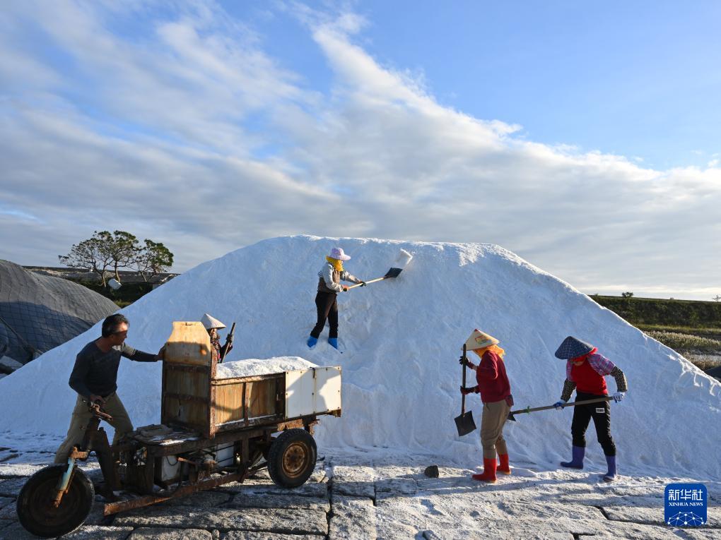 在福建省泉州市泉港山腰盐场,盐工们沿用传承千年的七步走水晒盐技法,依靠阳光、海风,将海水层层筛滤、纳潮、制卤、结晶、旋盐、扒收、淋卤、堆坨,历时多日晒制优质海盐。晒盐场景成为海岸线上一道独特的自然与人文景观。